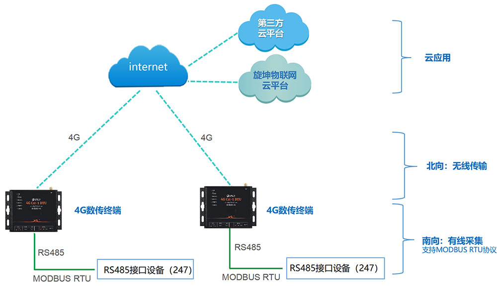 XKED930是一款工业级4G数传终端,支持4G LTE CAT1物联卡,支持APN专网接入;被监控设备通过RS485外接4G数传终端连接云平台,实现数据采集和设备监控,快速实现产品数字化升级。