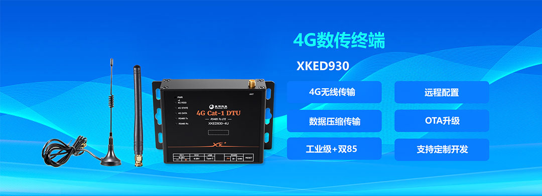 XKED930是一款工业级4G数传终端,支持4G LTE CAT1物联卡,支持APN专网接入;被监控设备通过RS485外接4G数传终端连接云平台,实现数据采集和设备监控,快速实现产品数字化升级。