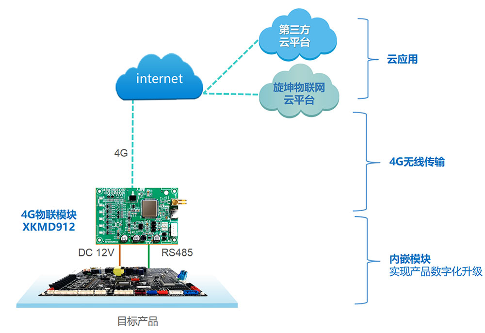 XKMD912是一款支持4G LTE CAT1 物联卡,满足双85试验要求的工业级4G物联模块。被监控设备通过内嵌4G物联模块接入云平台,实现数据采集和设备监控,快速实现产品数字化升级。